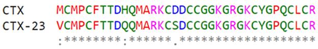 For example, SAaCtx, CTX and BmKCT, effective in the glioma and coming from different genera of the Buthidae family (Figure 1a), have the same mechanism of action and structural homology, the same happens with the peptides CA4 and CTX-23 (Figure 1b) and between Neopladin 1 and 2 (Figure 1c). Now, CTX and CTX-23, although they have a high structural similarity, have not elucidated that their mechanism of action is the same (Figure 2) (Xu et al., 2016).
