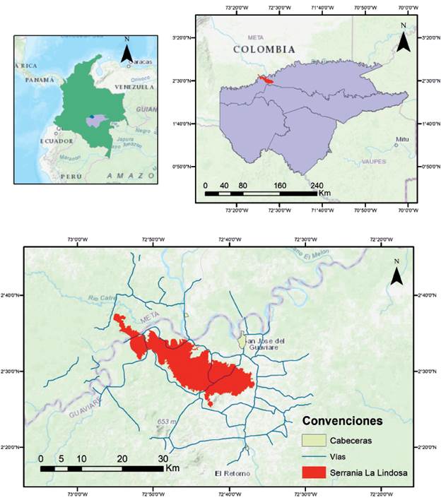 Figura 1: Mapa de ubicación de la Serranía La Lindosa y área de estudio