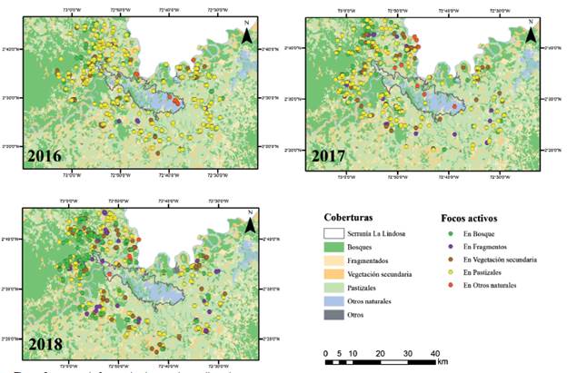 Los puntos estuvieron concentrados en principalmente en sección noroeste del área de estudio, hacia la Serranía de la Macarena, en el departamento del Meta para los tres años analizados (Fig. 2). El número de eventos de fuego por km2 tuvo grandes diferencias entre la serranía y el área búfer, presentándose 0,12 eventos/km2 en la primera y 0,54 eventos/km2 en promedio en la segunda. Los pastizales fueron los más afectados por eventos de fuego, casi triplicando su número frente a los resultados para otras coberturas durante los tres periodos analizados. De igual forma, los eventos de fuego casi se duplicaron para el periodo analizado del año 2018, excepto para las coberturas Otras naturales y Otros (Fig. 3).