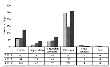Figura 3: Número de eventos de fuego por cobertura para los años 2016, 2017 y 2018