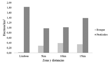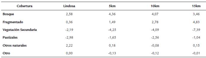 La transición de Bosques a Fragmentado, Vegetación secundaria y Pastizales se dio en mayor grado entre los 0 y 10 km del área búfer. El cambio de Bosques a Pastizales presentó las mayores magnitudes en las diferentes distancias búfer (6,14 ha/km2) respecto a la transición a Fragmentado y Vegetación secundaria (5,49 ha/km2 en promedio). Las zonas de bosque fragmentado tuvieron un mayor grado de transición hacia vegetación secundaria (9,3 ha/km2) seguida de Pastizales (6 ha/km2). Ambos cambios tuvieron valores más altos a partir de los 5 km del área búfer, con un promedio de 5,52 ha/km2 afectadas.