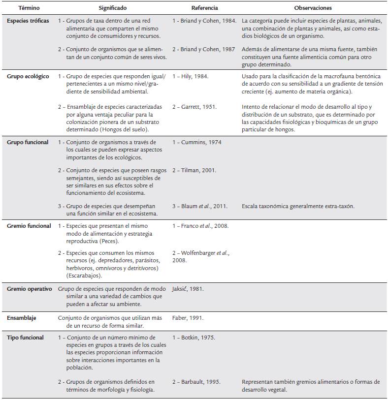 Tabla 1: Términos encontrados en la literatura ecológica y generalmente utilizados de manera equivocada como sinónimo de gremio.