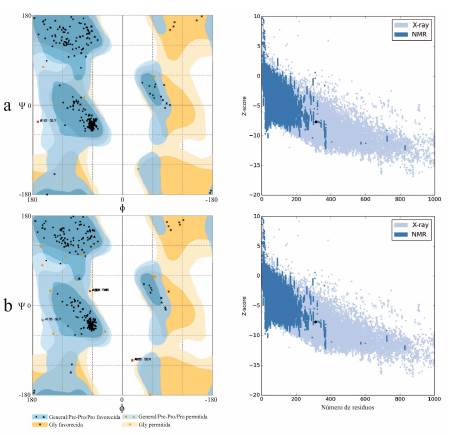 Fig. 3: Análisis de la calidad de las estructuras tridimensionales predecidas de las proteínas αACCasa de Chlorella sp. (a) y Scenedesmus sp. (b) con los plots de Ramachandran y ProSA-web. Los patrones de distribución de los enlaces peptídicos de los aminoácidos y el Z-score obtenidos por las αACCasa de ambas microalgas está de acuerdo con los patrones comunmente encontrados en las proteínas cuyas estructuras 3D han sido determinadas mediante cristalografía de rayos X y resonancia magnética nuclear.