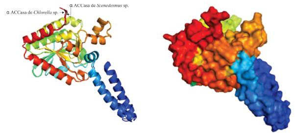Fig. 2: Comparación de las estructuras tridimensionales de las proteínas αACCasa de Chlorella sp. (a) y Scenedesmus sp. (b) generadas por predicción con base a estructuras 3D de proteínas homólogas que perviamente han sido obtenidas por cristalografía de rayos X. Ambas proteínas presentan el mismo patron estructural corroborando su conservación funcional en la catálisis de la transferencia de grupos carboxilo.