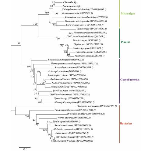 Fig. 4: Análisis filogenético de las αACCasa con base a las secuencias deducidas de las proteínas homólogas de microalgas, plantas, cianobacterias y bacterias. El árbol filogenético fue construido empleando el método Neighbor-Joining y las distancias de las ramas son las proporciones de las sustituciones de aminoácidos derivadas del modelo evolutivo Jones-Taylor-Thornton. Los valores de bootstrap corresponden a los porcentajes obtenidos a partir de 1000 réplicas.