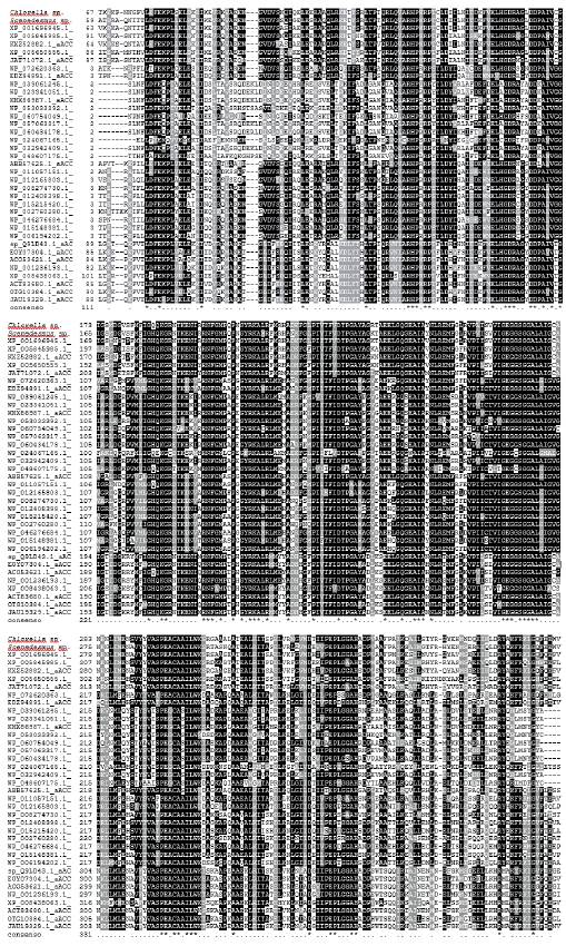 Se hizo una búsqueda Blast local con BlastStation 2 (TM Software, Arcadia, CA, USA) empleando la secuencia proteíca correspondiente de Chlamydomonas reinhardtii (XP_001696945.1) como un query para buscar en nuestra base de datos de los transcriptomas anotados de Chlorella sp. y Scenedesmus sp. y seleccionó las secuencias con E-valor < 1x10-5. Las secuencias nucleotídicas candidatas fueron extraídas de las bases de datos y corroboradas su identidad mediante análisis Blastp (Altschul et al., 1997) del GenBank (Benson et al., 2013).