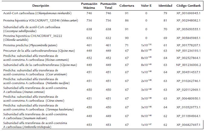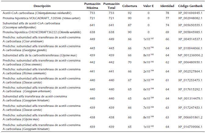 Tabla S3: Resultados del análisis Blastp para la secuencia aminoacídica de la αACCasa de Scenedesmus sp.