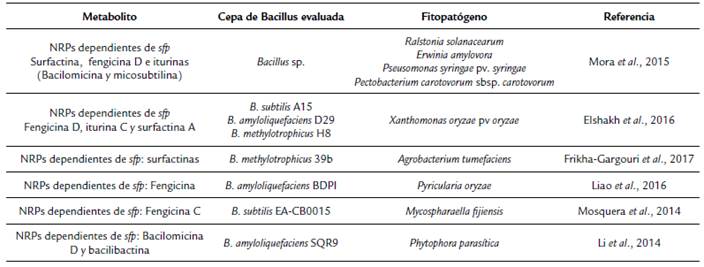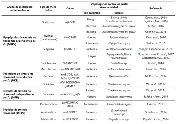 Estudios bioinformáticos a partir de la secuencia del genoma de diferentes cepas de Bacillus han permitido predecir la presencia de genes asociados con la producción de compuestos antimicrobianos, dando así un potencial mecanismo de acción de estos biocontroladores (Aleti et al., 2015). Estas bacterias pueden producir sustancias antimicrobianas de distinta naturaleza, que pueden ser divididas en los siguientes tipos: un grupo de péptidos de síntesis ribosomal, policétidos (PK) y pequeñas moléculas peptídicas de síntesis no ribosomal (NRPs por sus siglas en inglés) (Fickers et al., 2012).