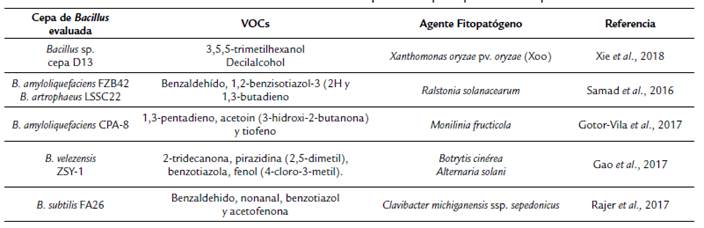 Tabla 2: Actividad antagonista in vitro de compuestos antimicrobianos de Bacillus spp. contra microorganismos fitopatógenos encontrada en estudios recientes.