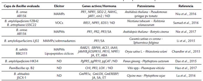 De otra parte, hay dos tipos de resistencia inducida: la inducción de resistencia sistémica (ISR) y la resistencia sistémica adquirida (SAR). La ISR es inducida por microorganismos benéficos a través de diferentes elicitores, dentro de los que se incluye MAMPs, VOCs, compuestos asociados a la degradación de la pared celular (Buterkova et al., 2014; Pieterse et al., 2014), sideróforos y lipopéptidos (NRPs) (Chandler et al., 2015). Esto permite deducir que la ISR elicitada por cepas de Bacillus spp. puede llevarse a cabo mediante PTI (Niu et al., 2016). De otra parte, la SAR es inducida por exposición temporal a patógenos a través de diversos elicitores (Li et al., 2016). Tanto en la ISR como en la SAR la señalización se encuentra mediada por fitohormonas como el ácido salicílico (SA), el ácido jasmonico (JA) y el etileno (ET) (Pieterse et al., 2014).
