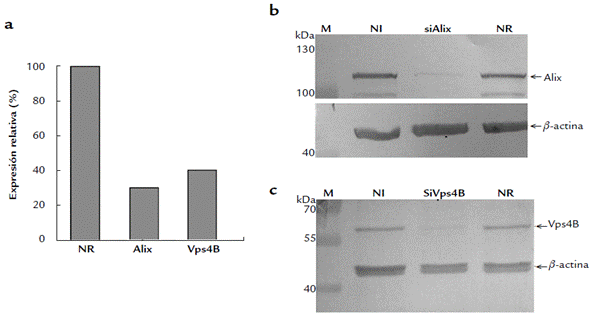 Los ensayos de MTT demostraron supervivencia de 95 a 100 % de las células tratadas con los siRNA, comparadas con el control no tratado. Los ensayos de qPCR confirmaron la reducción de la transcripción para Alix y Vps4B en las células tratadas con los siRNA específicos, al comparar con la transcripción en las células tratadas con el siRNA-NR (Fig. 1a). Por su parte, los ensayos de WB confirmaron la reducción de la expresión de las proteínas Alix (Fig. 1b) y Vps4B (Fig. 1c) en las células tratadas con los siRNA específicos. La expresión de la proteína control (actina) fue uniforme en los tres sistemas celulares (Figs. 1b y 1c).