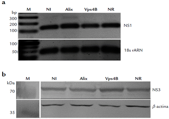 Se tomaron células A549 interferidas para Alix o Vps4B y sus controles, y se evaluó por RT-PCR la expresión del transcrito de NS1 y por "Western Blot" (WB) la expresión de la proteína NS3. Para el experimento de RT-PCR, el ARN fue extraído como se describió antes y se hizo la síntesis de ADN complementario (ADNc) usando M-MLV retro-transcriptasa (Promega) y finalmente una PCR para los genes nsl y 18S ARNr. Los oligonucleótidos usados fueron diseñados con el programa Primer-BLAST (www.ncbi.nlm.nih.gov/tools/primer-blast/) con base en las secuencias NP_739583.2 (nsl) (sentido: TGC-AGG-CCG-ATA-GTG-GTT y antisentido: TGC-AGG-CCG-ATA-GTG-GTT) y NR_003286.2 (18S ARNr) (oligo sentido: ATA-CAT-GCC-GAC-GGG-CGC-TG y oligo antisentido: AGG-GGC-TGA-CCG-GGT-TGG-TT). La reacción de amplificación se hizo con 1,5 mM de MgCl2, 200 μM de dNTPs, 1 μM de oligonucleótidos y 0,5 U de ADN polimerasa GoTaq Flexi (Promega). El programa de amplificación comprendió una desnaturalización inicial a 94 °C por 2 minutos, 30 ciclos de 94 °C por 45 segundos, 55 °C por 45 segundos y 72 °C por 60 segundos, seguidos por una extensión final de 72 °C por 10 minutos.