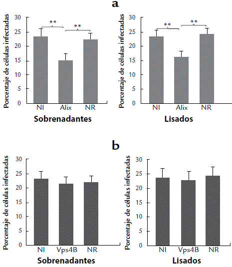 Figura 3: Efecto de la interferencia de las proteínas Alix y Vps4B sobre la producción de DENV2. Se muestra el porcentaje de infección viral en células LLCMK-2 tratadas con los lisados (para evaluar ensamblaje) o los sobrenadantes (para evaluar liberación) de células A549 infectadas con DENV2 e interferidas para las proteínas Alix (a) o Vps4B (b). Como controles se usaron células infectadas y no interferidas (NI), y células infectadas e interferidas con un siRNA no relacionado (NR). Se muestra el promedio de tres cultivos independientes y dos réplicas por condición. El doble asterisco indica las diferencias estadísticamente significativas (p < 0,01) que se obtuvieron al comparar con los controles NI y NR.