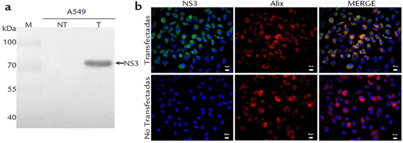 Se estableció una línea celular A549_NS3 en la que la proteína NS3 se expresaba de manera estable en el 100 % de las células bajo presión con Geneticina. La eficiencia de la transfección se confirmó mediante ensayos de WB (Fig. 4a) con el anticuerpo anti- NS3403_599. En las células transfectadas se observó una señal a la altura de «74 kDa, la cual correspondió al tamaño esperado para la proteína NS3 recombinante. Por su parte, los ensayos de IF sobre un cultivo A549_NS3 evidenciaron la expresión de NS3 en el 100 % de las células (Fig. 4b) y su localización citoplasmática, con una mayor intensidad hacia la región perinuclear. No hubo marcación en las células A549 no transfectadas. Adicionalmente, se realizó la inmunodetección de Alix como control de una proteína celular (Fig. 4b), y como era de esperarse, Alix se detectó tanto en células transfectadas, como en las células no transfectadas. Aunque el "merge" evidenció que NS3 y Alix colocalizan, ese resultado no permite establecer si hay una interacción directa entre ellas o si simplemente ocupan el mismo compartimento celular.