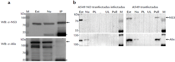 (a): Ensayo de co-inmunoprecipitación. M: Marcador de peso molecular Page-RulerPlus (Thermo-Scientific). Ext: extracto de células A549 transfectadas con un constructo que expresa la proteína NS3_His-tag. Nu: Fracción no unida (sobrenadante pos-inmunoprecipitación. IP: inmunoprecipitación con el anticuerpo anti-NS3403_599. Arriba: WB revelado con el anticuerpo anti-NS3403_599. Abajo: WB revelado con el anticuerpo anti-Alix. Las flechas indican las bandas correspondientes a NS3 (arriba) (≈ 74 kDa) y Alix (abajo) (≈ 100 kDa). Los asteriscos señalan las cadenas pesadas de las inmunoglobulinas. (b): Ensayos de "pull-down" usando células A549 infectadas con DENV2 y células A549 no infectadas, pero transfectadas con un constructo que expresa la proteína NS3_His-tag. El "pull-down" se hizo con una resina de unión a His-tag (Ni-NTA). Al terminar el ensayo, la resina fue cargada en un SDS-PAGE y analizada por WB con los anticuerpos anti-NS3403_599 y anti-Alix. Ext: extracto celular. Nu: Fracción no unida; sobrenadante recuperado después de la incubación con la resina y justo antes de los lavados. PL: Sobrenadante del primer lavado de la resina. UL: Sobrenadante del último lavado de la resina, antes del "pull-down". "Pull": "pull-down". M: Marcador de peso molecular Page-RulerPlus (Thermo-Scientific). Las flechas señalan las bandas correspondientes a la proteína NS3 recombinante (≈ 74 kDa) y Alix (≈ 100 kDa).