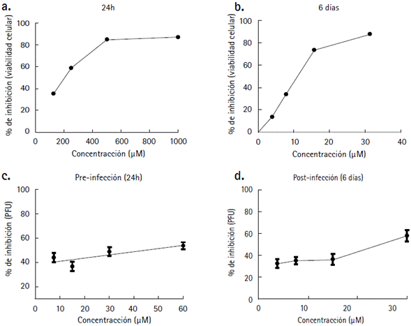 Para evaluar el efecto del compuesto previo a la infección de las células, diluciones seriadas (1:2) del inhibidor se prepararon y agregaron a los platos en un rango de concentración de 7,5-60 μM; células y compuestos se dejaron en incubación durante 24 h a 37 °C (5 % de CO2). Pasado este tiempo, se realizó un lavado de las células con PBS (phosphate buffered saline, pH = 7,4) y se infectaron con una multiplicidad de infección (MOI = 0,01 PFU/célula) del virus DENV-2. Luego de 2 h, las células fueron lavadas nuevamente con PBS y se les agregó CMC (carboximetilcelulosa) al 1,5 %.