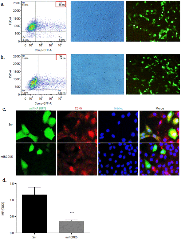 Figura 2: Efecto del silenciamiento con miARNs artificiales sobre la proteína CDK5. La eficiencia de transfección de los plásmidos Scr (a) y miRCDK5 (b) fue determinada por citometría de flujo y microscopía de fluorescencia (objetivo 10X) luego de 48 horas post transfección. El efecto del silenciamiento de los miARNs artificiales sobre la proteína CDK5 se evidenció por microscopia avanzada de fluorescencia (c). La cuantificación de la intensidad media de fluorescencia (d) se realizó empleando el software Image J. Los resultados son expresados como la media ± el error estándar de la media de tres ensayos realizados por duplicado. La comparación entre grupos se realizó usando una prueba t de Student de datos no pareados (**, p < 0,01) IMF: intensidad media de fluorescencia.