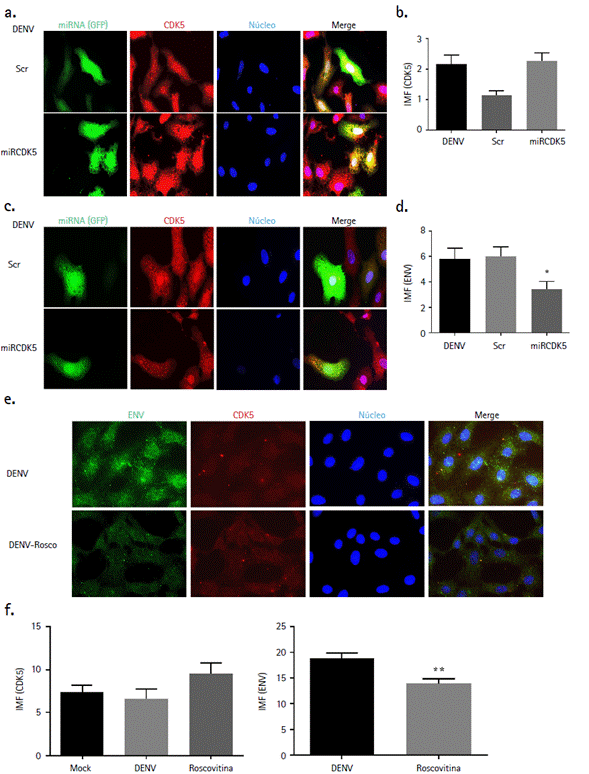 En paralelo, se comparó el efecto del interferente y roscovitina sobre la proteína CDK5 y de envoltura viral (ENV), durante la infección por el virus DENV-2. Luego de 24 horas post-infección (hpi) y 48 hpt con el miARN interferente, no se observó una reducción significativa en la intensidad de fluorescencia de la proteína CDK5 (Fig. 3a y 3b). Dicho resultado es inesperado ya que en células no infectadas, miRCDK5 reduce de manera eficiente la IMF de CDK5. Por su parte, el tratamiento por 24 h de las células infectadas con el inhibidor químico (Fig. 3e y 3f), tampoco reduce la IMF de CDK5. Dicho efecto es esperado ya que roscovitina actua como un inhibidor de la función de CDK5, pero no de su expresión en las células tratadas. Sin embargo, se observó una reducción significativa de la proteína ENV en presencia del interferente (Figs. 3c y 3d) y de roscovitina (Figs. 3e y 3g), lo cual puede estar asociado con una disminución en la replicación del genoma viral y/o traducción proteica.