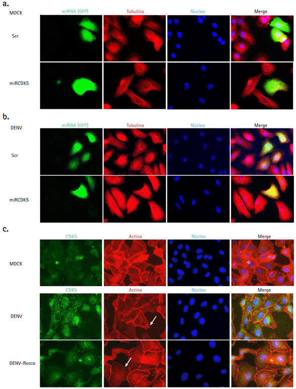 Finalmente, el efecto sobre elementos del citoesqueleto (actina y microtúbulos) fue evaluado en presencia de miRCDK5, así como del inhibidor químico. En las figuras 4b y 5b no se aprecian cambios evidentes sobre los filamentos de actina ni sobre la distribución de los microtúbulos en las células transfectadas con Scr o miRCDK5 y posteriormente infectadas con DENV-2, en comparación con los controles no infectados (Figs. 4a y 5a). Sin embargo, durante el tratamiento con roscovitina se evidencian cambios moderados en la morfología celular, reducción en la cantidad de fibras de estrés y proyecciones de la membrana plasmática (Fig. 4c), así como alteración de la distribución de los microtúbulos (Fig. 5c), particularmente durante la infección por DENV.