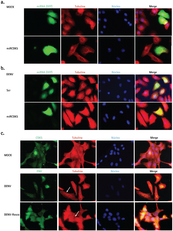 Figura 5: Efecto de miRCDK5 y roscovitina sobre la distribución de los microtúbulos durante la infección por virus DENV-2. Células Vero fueron transfectadas (b) o tratadas con roscovitina (c), infectadas con DENV-2 y tenidas para observar su efecto sobre los microtúbulos comparado con el mock (a). Las imágenes son representativas de tres experimentos realizados por duplicado y fueron capturadas con un objetivo de 60X. Las flechas cambios en la morfología celular y en el patrón de distribución de los microtúbulos durante el tratamiento con roscovitina en comparación con el control de infección no tratado. ENV: proteína de envoltura viral. Rosco: roscovitina.