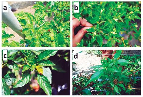 Figura 1: Variedades de ají (Capsicum spp.) colectadas en campo y síntomas observados en la mayoría de las muestras positivas a begomovirus. a., ají habanero (Capsicum chínense) con síntomas como deformación rugosa de la lámina foliar y mosaicos; b., ají tabasco (Capsicum frutescens) con deformación rugosa de la lámina foliar e islas verdes; c., ají cayena (Capsicum annuum var. acucminatum) asintomática; d., ají jalapeño (Capsicum annuum) asintomática.
