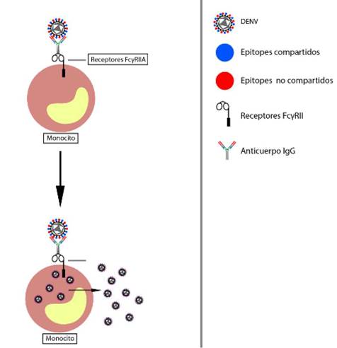 En condiciones de ADE, el proceso temprano de infección celular mediada por anticuerpos (ADE extrínseco), comienza con la unión del complejo virus-anticuerpo al receptor Fcy (FcyR, Fc gamma receptor) por la región Fc (crystallizing fragment) del anticuerpo IgG. Los receptores Fcy en humanos, se clasifican en tres tipos, FcyRI, FcyRII y FcyRIII o también denominados por sus clústeres de diferenciación (CD) CD64, CD32 y CD16 respectivamente (Guilliams et al., 2014). Estos receptores Fcy se expresan en monocitos, macrófagos y células dendríticas y cumplen la función de ser potentes inductores de la fagocitosis en microorganismos opsonizados (DENV para este caso), sin embargo, como se muestra en la Figura 1, en condiciones de ADE para DENV, estos receptores contribuyen aumentando la infectividad viral que a su vez se relaciona con mayor activación inmune y endotelial favoreciendo la progresión a dengue grave (Wang et al., 2003; Wang et al., 2017).