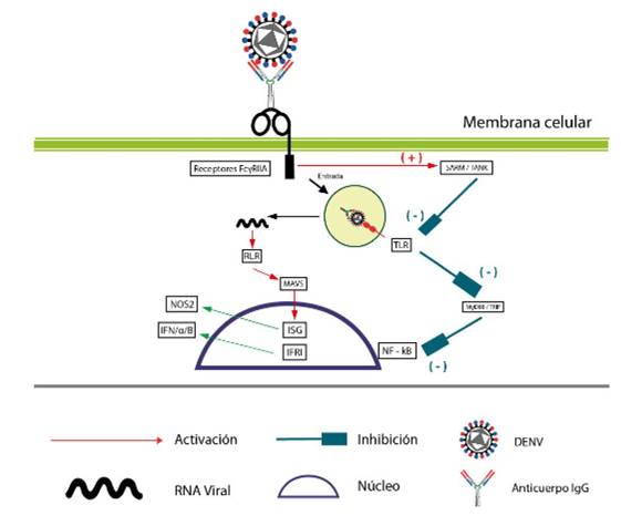 Después de la internalización del DENV por el FcyR, la activación de la cascada de señalización por los motivos ITAM induce un apagamiento de la inmunidad innata, proporcional al aumento en la producción de partículas virales (ADE intrínseco). Por ejemplo, en el reporte de Modhiran et al., (2010) se describieron análisis de RT-qPCR, western blot y microarrays con el objetivo de identificar si las infecciones por DENV mediadas por el complejo inmune tenían algún efecto sobre la señalización de los receptores tipo toll (TLRs). En resumen, encontraron que la unión de los complejos inmunes disminuía la transcripción de TLRs, además de estimular la expresión de SARM (Sterilealpha and armadillo motif) y TANK en células monocíticas (Figura 2), lo que aparentemente contribuye a mayores tasas de replicación viral y por ende, viremias más altas y mayor activación inmune, que se pueden relacionar con el desarrollo de dengue grave.