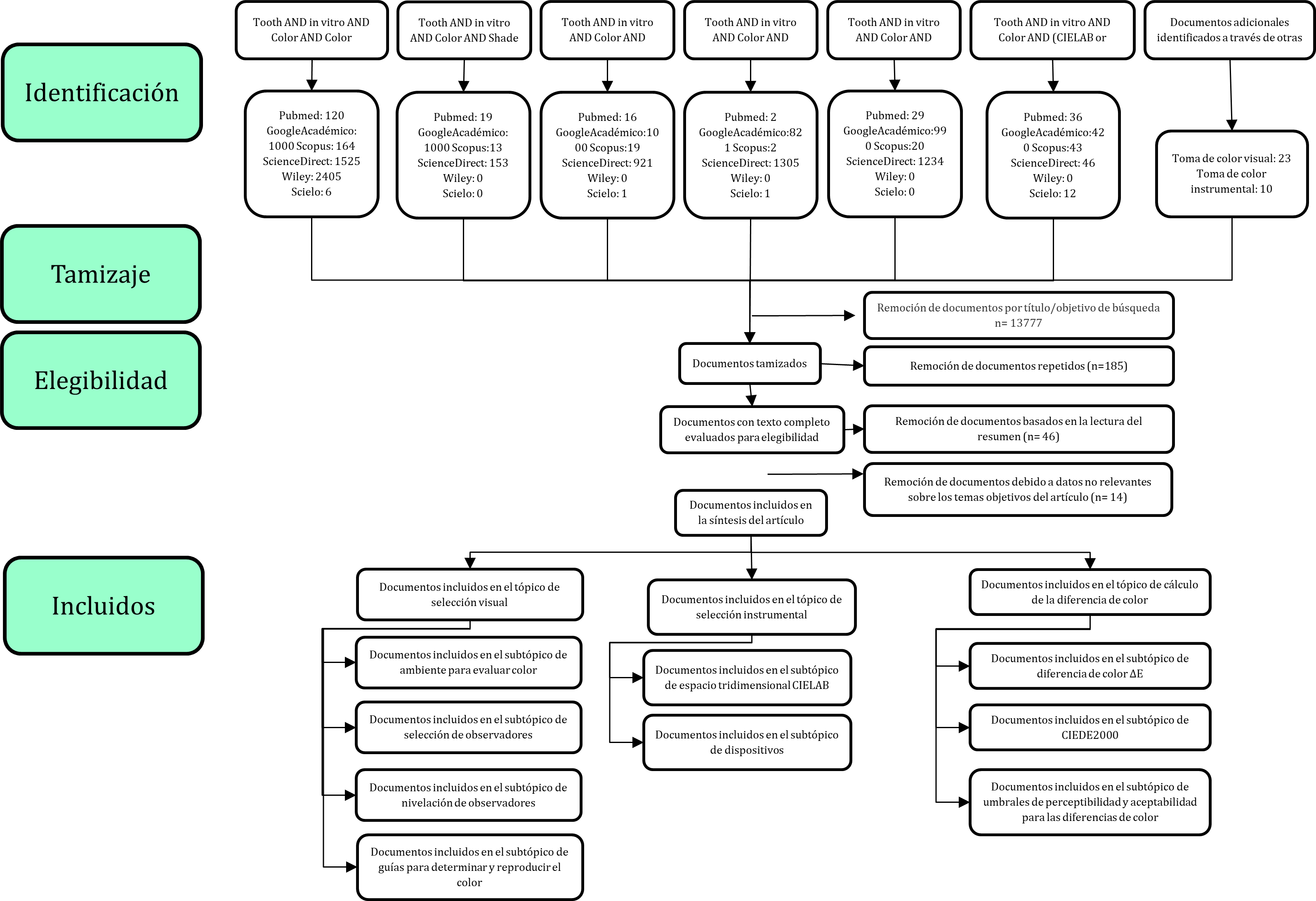 En primer lugar, se consultaron las bases de datos bibliográficas Pubmed, Web of Science, Science Direct, Scopus, Google Académico, Wiley, Scielo, Lilacs y Springer. Las palabras clave utilizadas fueron tooth, color, in vitro, color perception, shade matching, thresholds, appearance, surrounding, CIELAB y CIEDE2000. Para ello, se usaron ecuaciones de búsqueda con los conectores booleanos AND y OR (Véase Tabla 1).