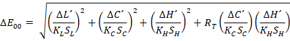 La fórmula CIEDE2000 [1:1:1] fue diseñada para que las diferencias de color fueran homogéneas en cuestiones perceptuales; no obstante, su uso no coincide con los juicios visuales desarrollados en la evaluación subjetiva del color (13, 36). Por esta razón, surge la fórmula CIEDE2000 [2:1:1] que corrige la uniformidad en pequeñas diferencias de color existentes, los efectos de la dependencia de la luminosidad, el croma, el tono, la interacción entre el tono y el croma, así como la escala a lo largo del eje a*, para mejorar la uniformidad en los tonos grises. La literatura asegura que la fórmula de diferencia de color CIEDE2000 ofrece mayor ajuste en cuanto a las diferencias de color percibidas por juicios visuales, lo que proporciona mejores resultados en percepción y aceptación (33, 36). En consecuencia, sugieren el uso de la métrica de diferencia de color CIEDE2000 [2:1:1] (3, 10). Sin embargo, ninguna fórmula actualmente ha sido 100 % eficiente (34). Para calcular CIEDE2000 (ΔE00) se utiliza la siguiente fórmula (33):