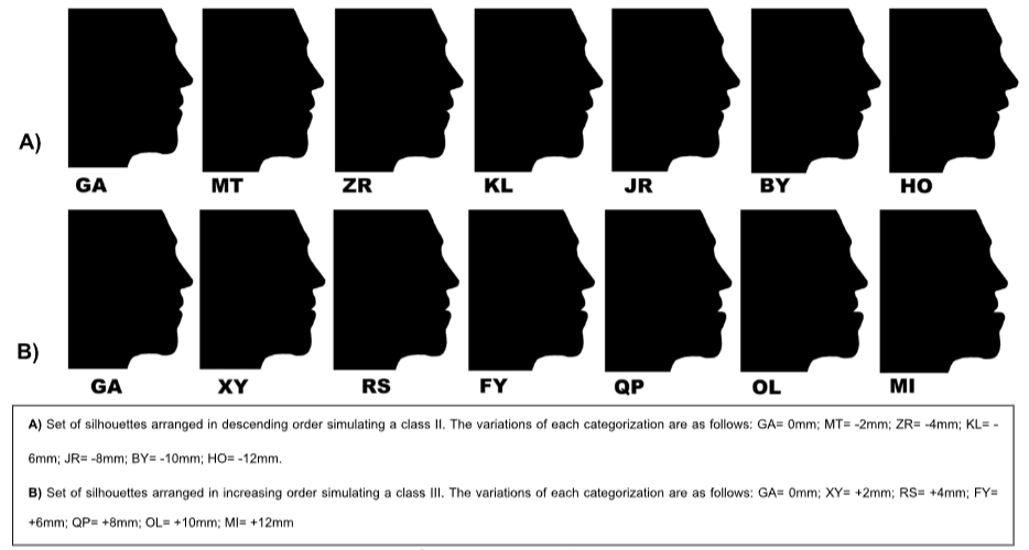 The evaluators were shown the images divided into two predefined sets with 8 silhouettes each, randomly, identified by two letters previously defined at random. One set includes the original silhouette, all silhouettes that simulate a class III (+2 to +12) and an intentionally selected class II silhouette; instead, the other set includes the original silhouette, all the silhouettes that simulate a class II (-2 to -12) and an intentionally selected class III silhouette. The original silhouette and the intentionally selected Class II and III silhouettes allow the determination of intra-examiner reliability.