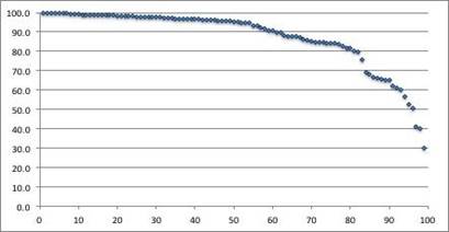 Gráfico 1.: Distribución de las 99 palabras que conforman el REALD en español organizadas por su porcentaje de respuesta.
