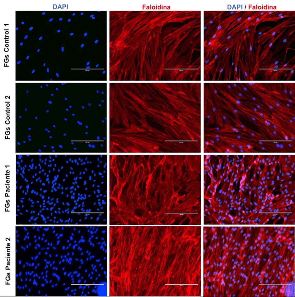 Por su parte, la identificación de la actina puso de manifiesto la presencia de los filamentos esenciales del citoesqueleto de los FGs. Sobre esto, es relevante informar que el presente trabajo utilizó la faloidina con fines de visualizar la actina y no con el propósito de cuantificarla. Empero, esta limitación no impidió constatar, en la monocapa de los FGs de pacientes del grupo test, una densa red de actina en relación a los FGs del grupo control. De esta forma, se estima que el nivel de visualización del inmunomarcaje de la actina, en las células de los pacientes pertenecientes al grupo test, obedeció al mayor número de células presentes al momento de su identificación, como eventual consecuencia de una mayor tasa de proliferación de los FGs en cultivo.