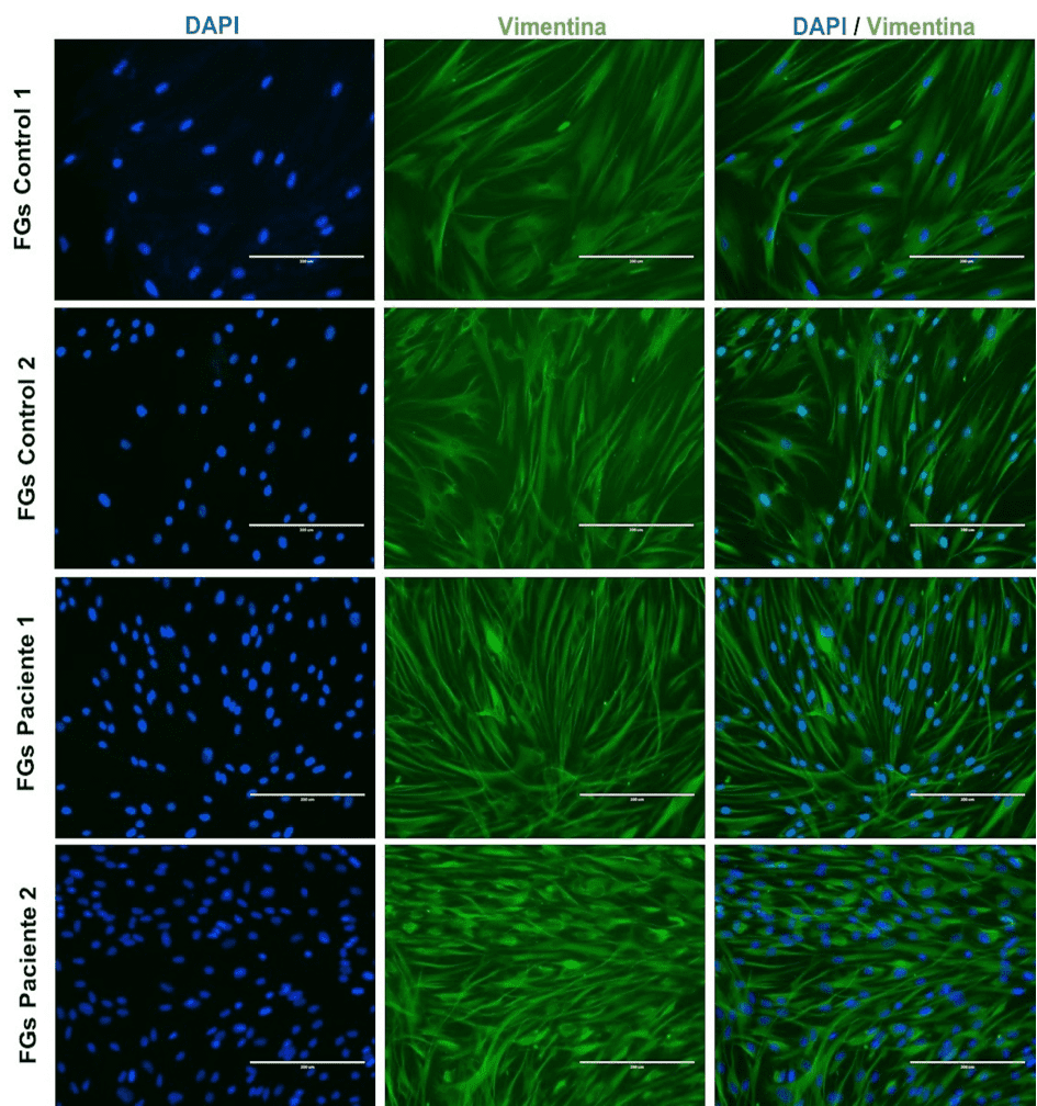 La inmunodetención positiva de la vimentina, proteína fibrosa que hace parte de los filamentos intermedios, fue observada en los FGs de los individuos del grupo control y del grupo test. En la monocapa de los FGs de ambos grupos no se identificó alteraciones en la expresión de la vimentina que hicieran intuir cambios morfológicos o estructurales de las células estudiadas. Aunque, se pudo constatar una red compacta de la expresión de la vimentina en los FGs del grupo test, en contraposición a los FGs del grupo control (Figura 2).