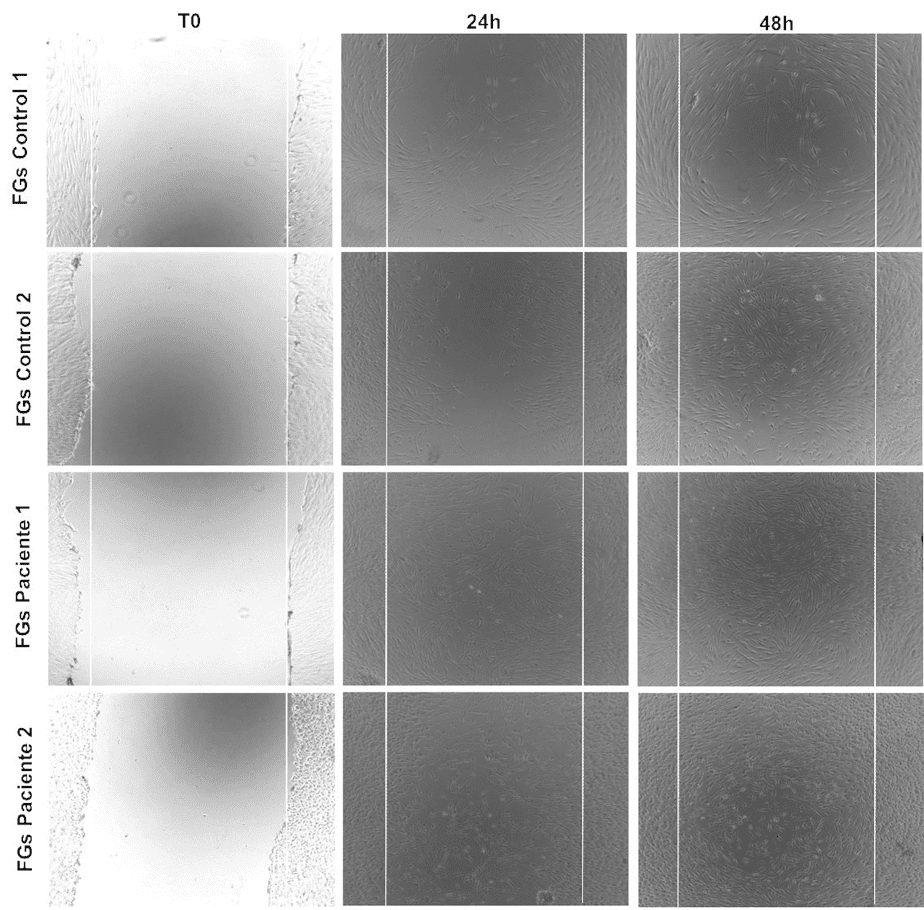Los FGs de los diferentes pacientes, incluidos en el presente trabajo, fueron cultivados en cajas de 6 pozos por triplicado. Una vez en confluencia (90% aproximadamente), una cicatriz fue realizada con la ayuda de un cono estéril, de acuerdo a lo descrito por Grada et al. (13). Las fotografías fueron realizadas a las 0, 24 y 48 horas, con el fin de evaluar la capacidad de las diferentes poblaciones celulares para migrar.