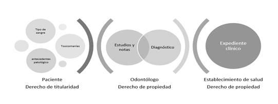 Desde el ámbito jurídico es importante, a efecto de identificar derechos, obligaciones y posibles responsabilidades, determinar a qué sujeto corresponde la titularidad y la propiedad tanto del biodato como del expediente clínico: el paciente es titular de todos los biodatos contenidos en las Tablas 1 y 2; en caso de que este sea incapaz, jurídicamente hablando (menor de edad, enfermedad con periodos de inconciencia, entre otros), sus biodatos pertenecen a quien ejerza la representación legal. La propiedad del expediente corresponde al odontólogo. Ahora bien, si sus servicios son prestados en un establecimiento de salud, la propiedad corresponde tanto al establecimiento como al estomatólogo (copropiedad). En este sentido, el expediente clínico es un conjunto de biodatos que proceden del paciente y/o han sido deducidos por el odontólogo, así como un conjunto de derechos de titularidad del paciente y de propiedad del profesional de salud y/o establecimiento, tal y como muestra la Figura 2.