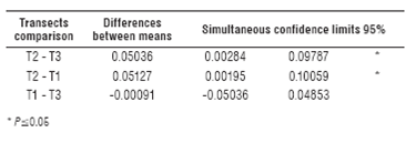 With the Bonferroni test the effects among transects were contrasted for each soil variable. Table 1 shows that CO2 flux in T1 transect had significant differences with the T2 transect, but not with the T3 transect, while T2 showed significant differences with T3 (Fig. 4). In Table 2 it was observed that there were significant difference regarding moisture content among transects, while Tab. 3, shows that there were only significant differences in soil tem perature between T1 and the other two transects (Fig. 4), nevertheless, there was no difference in Ts between T2 and T3 transects.