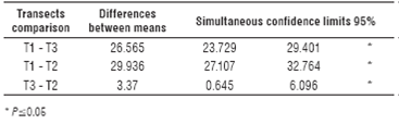 TABLE 3: Bonferroni test for contrast among transects for Ts variable.