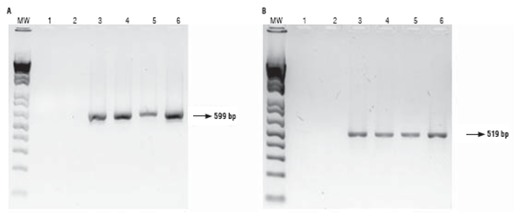 FIGURE 1: Gel electrophoresis of PCR products using primers UBI-CRY (A) and CRY1F (B). MW: molecular weight marker, 1: negative control (no DNA), 2: parental 81 (non-GM), 3: parental 28 (GM), 4: hybrid 286 x 285, 5: hybrid 288 x 287, 6: hybrid 289 x 290.