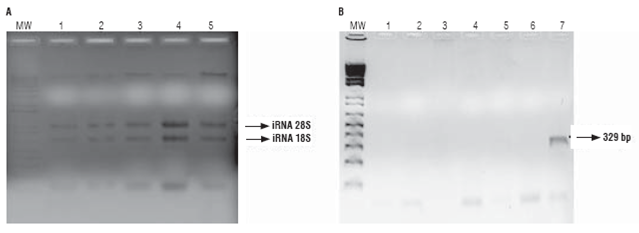 FIGURE 3: A. Gel electrophoresis of RNA extraction; B. Gel electrophoresis of RNA PCR products using primers ZP1. MW: molecular weight marker, 1: negative control, 2: parental 81 (non-GM), 3: parental 28 (GM), 4: hybrid 286 x 285, 5: hybrid 288 x 287, 6: hybrid 289 x 290, 7: positive control (parental 28 DNA).