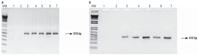 FIGURE 4: Gel electrophoresis of RT-PCR products using primers CRY1F (A) and PAT (B). MW: molecular weight marker, 1: negative control, 2: parental 81 (non-GM), 3: parental 28 (GM), 4: hybrid 286 x 285, 5: hybrid 288 x 287, 6: hybrid 289 x 290, 7: positive control (parental 28 DNA).