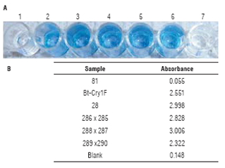 For the cry1F gene, an Agdia® ELISA Bt-Cry1F kit (cata logue number PSP1031) was used. From each sample, 0.15 g of leaf tissue were macerated in 3 mL extraction buffer. As negative controls, wells with buffer only and tissue from the non-GM parental line were included. Kit-provided Cry1F protein was used as a positive control. The assay was carried out according to manufacturer's instructions. Results were obtained visually and by measuring absorbance at 650 nm.