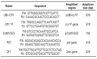 The presence/absence of the genetic elements from HER-CULEX® I was tested. Five seeds per hybrid line were germinated under greenhouse conditions and leaves were obtained to perform duplicate assays. Primers were desig ned using the sequence of the genetic construct reported in patent US 7449564, SEQ ID 25 (Barbour et al., 2008a). The primers (Table 1) amplify the following fragments: 3' region of the maize ubiquitin promoter and 5' region of the cry1F gene, cry1F gene sequence, CaMV35S promoter, and pat gene. The presence of these four elements was tested by PCR. When necessary, primers for the constitutive zein gene were used.