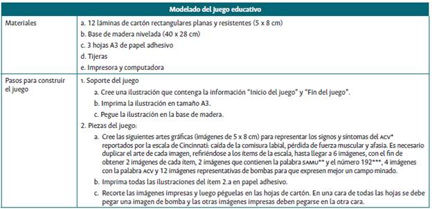 La presente investigación se desarrolló en dos momentos: primero, la construcción y validación de una tecnología sanitaria en forma de juego educativo; y segundo, la implementación de acciones. Para la construcción de la tecnología en salud, se realizó una revisión de literatura narrativa con el fin de identificar estudios sobre el tema y juegos educativos lúdicos que pudieran ser utilizados o adaptados. Los juegos encontrados no resultaron ser adecuados para el abordaje de la problemática analizada, por lo que se desarrolló un juego educativo en salud guiado por la metodología Ludic Reinvention9. La tecnología construida fue denominada "Campo Minado - Cuidado con el ACV", cuyo diseño adoptó los estudios de la Cincinnati Pre-Hospital Stroke Scale como contenido principal, puesto que esta permite una rápida evaluación de pacientes con sospecha de ACV 10. El modelado del juego se presenta en el Cuadro 1.