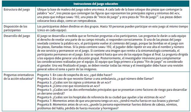 Los aportes de esta investigación son interesantes y relevantes para la práctica en el área de la salud pública. Además, contribuyen al ejercicio de una práctica innovadora por parte de los profesionales de la salud en atención primaria, en cuanto a la prevención de enfermedades cerebrovasculares, debido a que el uso de juegos educativos puede ser considerado una estrategia de enseñanza más atractiva y creativa en temas de salud, cuyo propósito es empoderar a las personas en la toma de decisiones. Así, el objetivo de este estudio fue evaluar la implementación de un juego educativo para el reconocimiento temprano de la enfermedad cerebrovascular aguda en personas con DM e HA.
