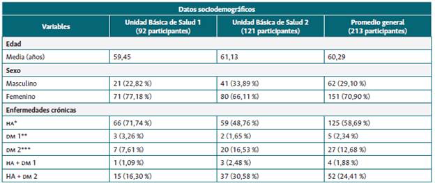 Como se describe en la Tabla 1, la mayoría de los participantes en ambas UBS son de sexo femenino (70,89 % de la muestra), con una media global de 60,29 años. La enfermedad crónica más prevalente en la población de estudio fue HA de manera aislada (58,68 %) y en conjunto con DM tipo 2 (24,41 %). Las otras enfermedades crónicas registradas fueron DM tipo 2 aislada (12,67 %) y DM tipo 1 aislada (2,34 %) y asociada a HA (1,87 %).