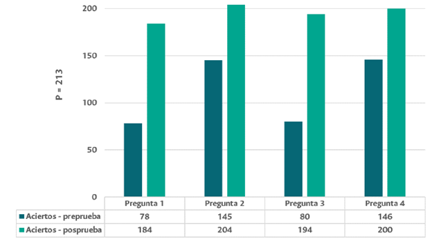 En la Figura 1 se observa el recuento general de las respuestas correctas para cada pregunta de los cuestionarios resueltos por los participantes. Se puede observar que hubo un aumento significativo en el porcentaje de respuestas correctas en los cuestionarios aplicados después de la intervención. En cuanto a la primera pregunta, después de la implementación de la actividad educativa se encontró que 49,76 % (n = 106) del total de participantes en esta actividad aprendieron a reconocer tres o más signos y síntomas de ACV. En cuanto al conocimiento sobre el servicio a contactar vía telefónica ante una situación de emergencia, el porcentaje de aciertos de los participantes aumentó a 95,8 % (n = 204) después de la sesión educativa.