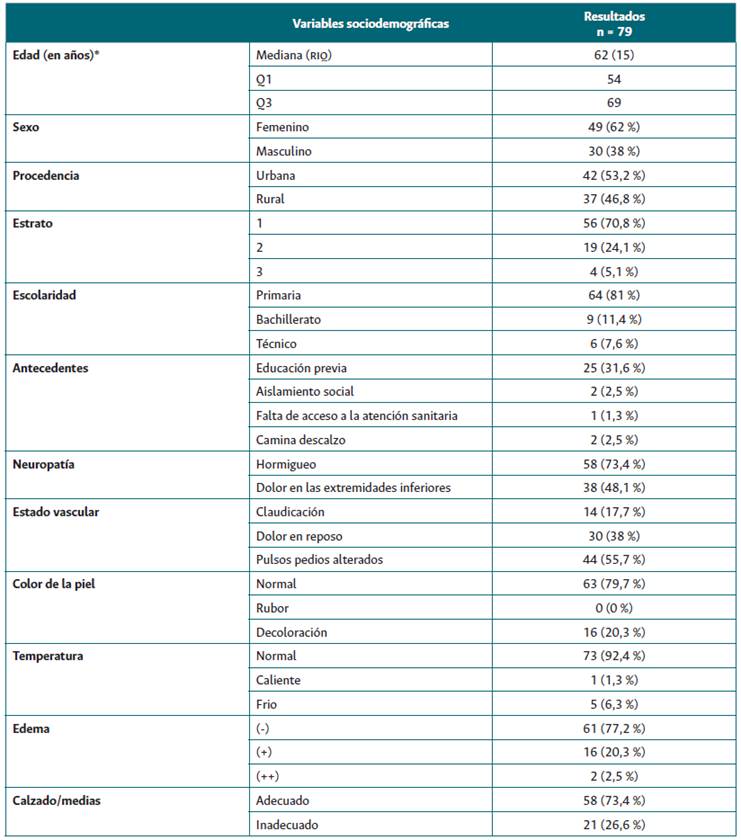 En total, se contó con la participación de 79 individuos con DM tipo 2, sin pérdidas en el seguimiento, cuya mediana de edad fue de 62 años. Entre los participantes, predominaron los individuos de sexo femenino (n = 49; 62 %), de procedencia urbana (n = 42; 53,2 %) y pertenecientes al estrato socioeconómico 1 (n = 56; 70,9 %). Los antecedentes más destacados fueron la neuropatía, el estado vascular, los cambios en la piel y el uso de calzado inadecuado (descubierto, apretado, tacones, entre otros). La educación previa sobre las medidas preventivas para el PD solo se presentó en el 31,6 % (n = 21) de los participantes. El síntoma neuropático más común fue el hormigueo (73,4 %), mientras que en el estado vascular la alteración más prevalente fue la de los pulsos pedios (55,7 %) (Tabla 1).