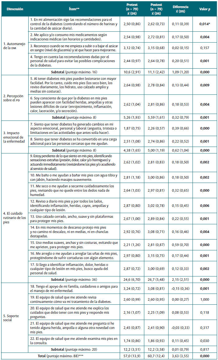 La Tabla 2 describe las mediciones pretest y postest del nivel de autocuidado en la prevención del PD. Los aspectos que muestran mayor afectación son los emocionales, personales y laborales y el cuidado pedio (medias, secado y calzado), sumados a la poca información y valoración que el equipo de salud realiza a nivel pedio. Tanto en la medición pretest como postest, los participantes fueron clasificados en nivel medio de autocuidado, con una diferencia de 3,63 puntos (SD = 3,55), que es estadísticamente significativa y da cuenta de una mejoría en el nivel global de autocuidado (p = 0,000); específicamente en las dimensiones automanejo de la DM (p = 0,000), percepción sobre el PD (p = 0,001), impacto emocional (p = 0,000) y cuidado rutinario pedio (p = 0,000). La única dimensión que no evidenció cambios significativos fue la de soporte social (p = 0,817). Así, los resultados globales permiten aceptar la hipótesis alterna: la intervención educativa sí genera cambios en el nivel de autocuidado en la prevención del PD (H1: p < 0,05).