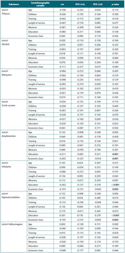 Cross-sectional study conducted with 229 soldiers from an infantry battalion at the Brazilian Army. Data were collected in 2019 with the application of a sociodemographic and employment instrument, the Alcohol Smoking and Substance Involvement Screening Test (ASSIST), and the Pearson correlation test.