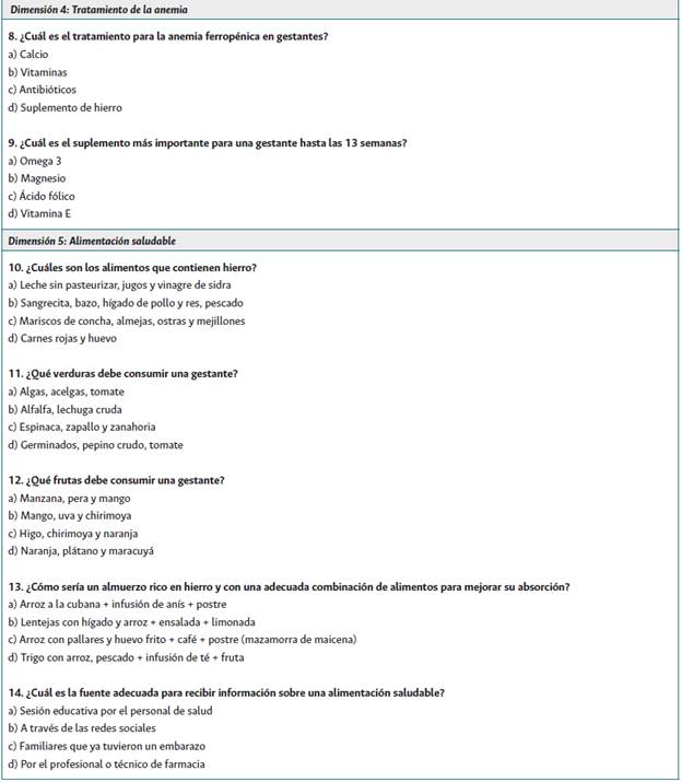 La variable dependiente de naturaleza cuantitativa fue "Conocimientos sobre anemia ferropénica", medida a través de un cuestionario autoaplicable de 14 preguntas, donde cada pregunta tuvo cuatro alternativas de respuesta, siendo solo una de ellas correcta (Cuadro 1). Además, los conocimientos sobre anemia ferropénica se clasificaron en cinco dimensiones: i) Generalidades de la anemia, que constó de la definición de la anemia y el examen de hemoglobina; ii) Causas de la anemia; iii) Consecuencias de la anemia; iv) Tratamiento de la anemia, donde se preguntó a las gestantes acerca de los suplementos de hierro y ácido fólico; y v) Alimentación, cuyas preguntas constaron de los alimentos ricos en hierro 25. El cuestionario fue creado por los autores del presente estudio tomando referencias de fuentes confiables para su elaboración 25,26. Además, el instrumento fue validado por jueces expertos de las profesiones de enfermería, nutrición y dietética. Como resultado se tuvo una validez de 0,96 mediante el coeficiente de V de Aiken y una confiabilidad de 0,83 con el coeficiente de Alfa de Cronbach.
